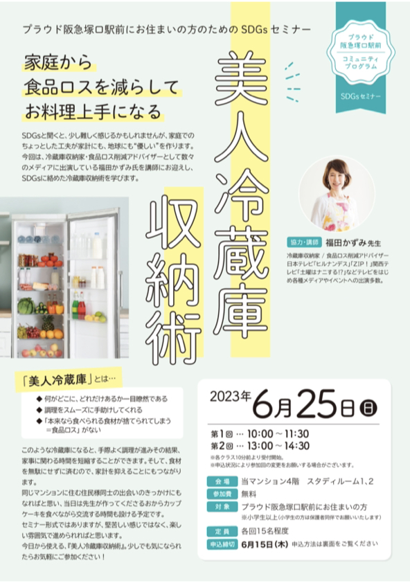 今回は、2023年6月23日に開催したマンションにお住まいの方のためのコミニティプログラム「家庭から食品ロスをへらしてお料理上手になる冷蔵庫整理収納セミナー」の様子をご紹介します。